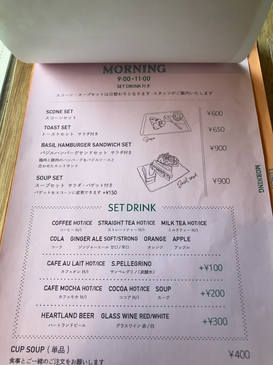 “ We arrived right when the place opened. We ordered the scone set (650 yen) and the basil hamburger sandwich set (800 yen). Both were very reasonably priced and tasted great. The coca cola option came in a thick glass bottle which I thought was pretty cute. ”